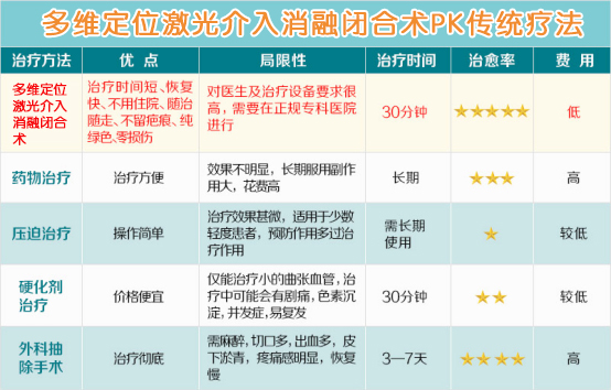 【治疗方法】:“超微创疗法”的原理是在红外线精确定位,多普勒显影系统引导下,将高效的激光能量通过光纤传送至曲张的静脉血管内,快速直达病变的曲张静脉,使其形成纤维化,永久地闭合。祛除了静脉曲张的根本病因,是代替传统手术治疗创伤大、花费多、过程痛苦的有效方法,被医学界和患者公认为是治疗静脉曲张的好疗法。