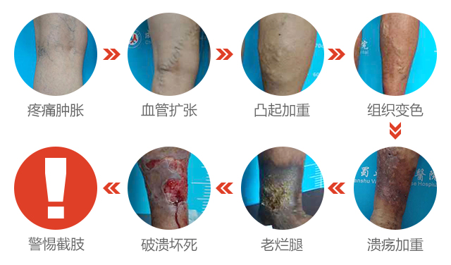 五期:溃疡面积扩大,发展为老烂腿。出现以上症状都没有及时治疗时,静脉曲张进入为急性溃疡期,发黑变硬的皮肤在外力作用下发生破溃,很难自愈,严重影响工作与生活,甚者有截肢危险。另一方面,老烂腿得不到治疗,发展为菜花状,容易引发癌变。