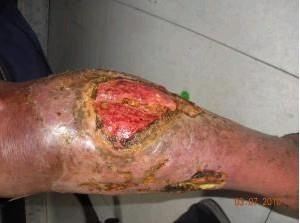 4、那些时间久、范围大,骨头也有感染的老烂腿溃疡还有待于“剥皮”手术。在半身止痛下,将病变的皮肤切除,有病变的骨头表面也要削去,直至正常部位。然后用附近或对侧,或身体其它供应的皮肤来修补。溃疡恶变成癌的,必须采取截肢手术。